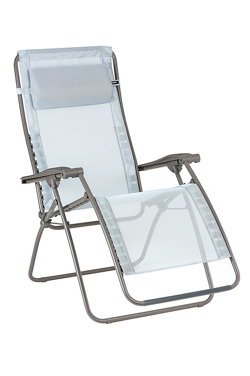 Structure tube acier Ø20 mm. Accoudoirs bi-matières résine / mousse, réglage de la position avec stabilisateurs. Têtière ergonomique, réglable et amovible. Bague de protection repose pieds et patins de pieds, toile Batyline amovible avec fixation de la toile par clips en élastomère (brevet Lafuma).